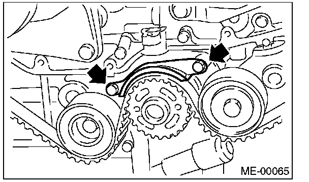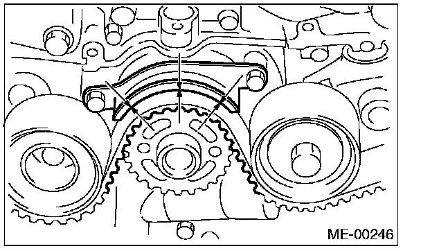 2. Using white paint, put an alignment mark or an arrow mark on timing belts in relation to the crank sprocket and cam sprockets.