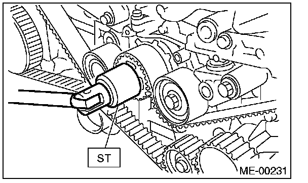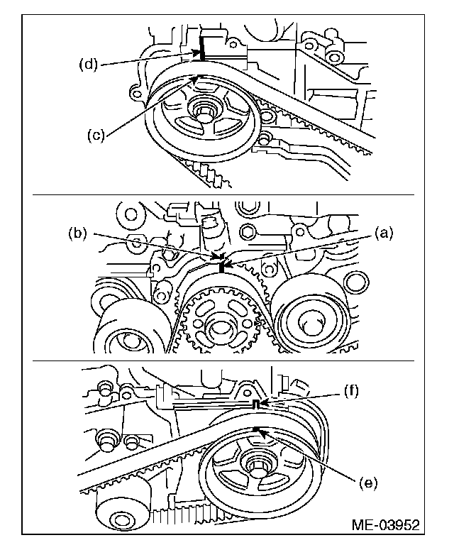 1. Use the ST to turn crankshaft. Align the mark (a) of sprocket to the mark (b) of oil pump, and then ensure the right side cam sprocket mark (c), cam cap and cylinder head matching surface (d) or left side cam sprocket mark timing belt cover notch (f) are properly adjusted.