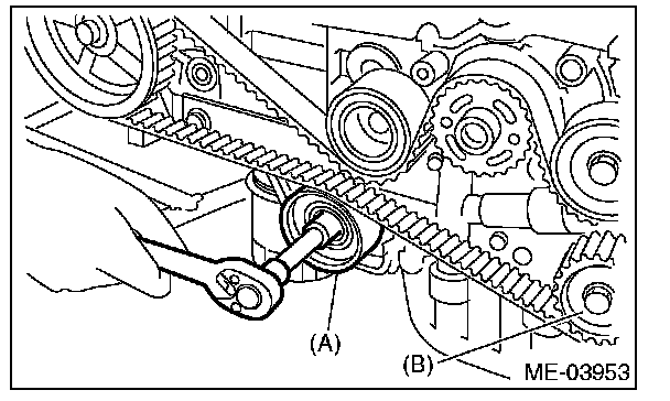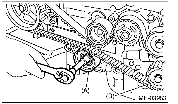 4. While aligning the alignment mark (B) on timing belt with the mark (A) on sprockets, position the timing belt properly.