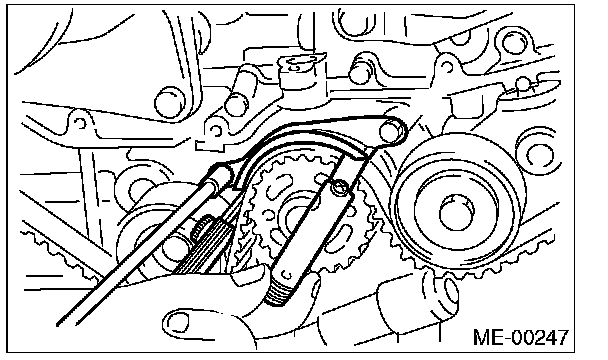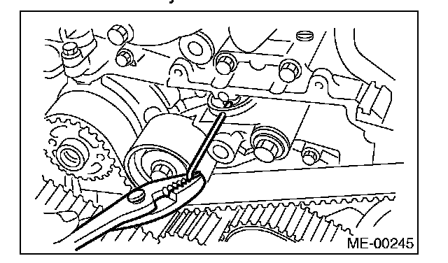 7. After ensuring the marks on timing belt and camshaft sprockets are aligned, remove the stopper pin from belt tension adjuster.