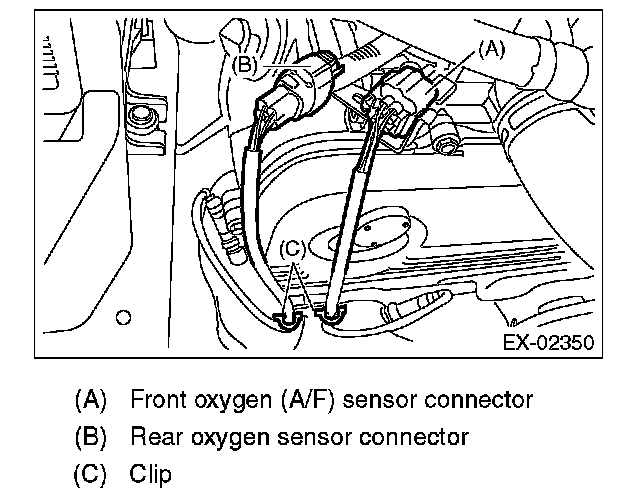 4. Remove the clip fastening the harness and disconnect the front oxygen (A/F) sensor connector.