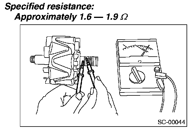 Check the continuity between slip ring and rotor core or shaft. If the resistance is 1 ohm or less, replace the rotor assembly because the rotor coil is grounded.