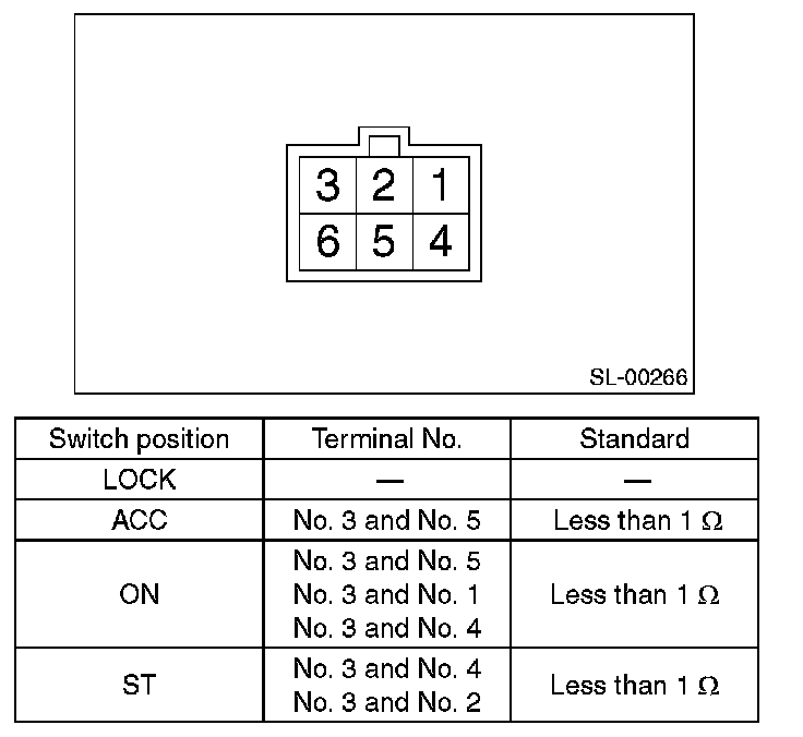 4. Turn the ignition key plate to each position and check the continuity between terminals of ignition connector.