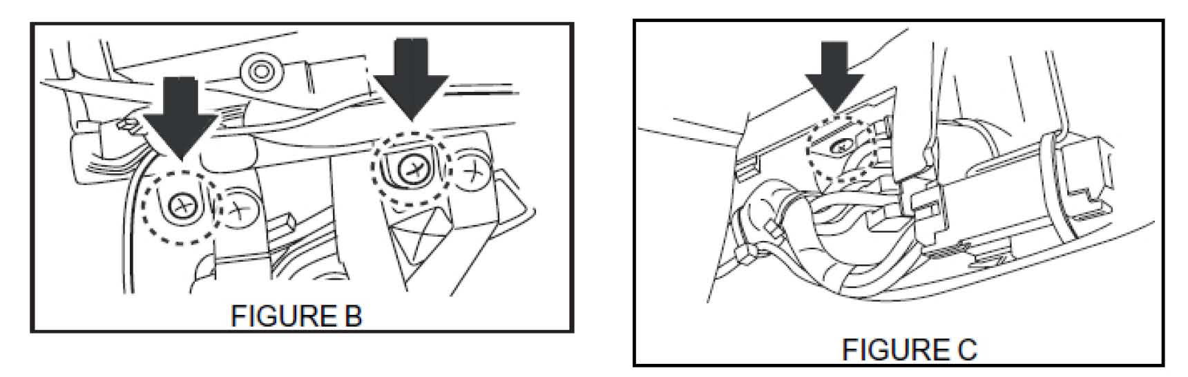 (2) Using a phillips screwdriver, remove (2) phillips screws securing the front of the upper steering column shroud (FIGURE B) and remove (1) phillips screw on the rear left side of the steering column securing the rear of the upper steering column shroud (FIGURE C). Carefully remove the upper steering column shroud.