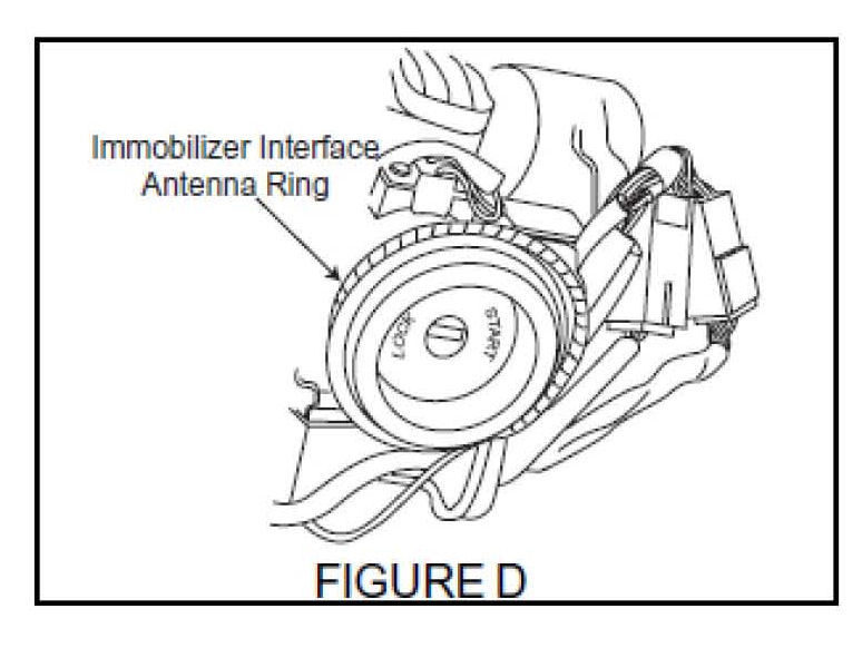 (1) Locate the previously installed immobilizer interface antenna ring at the vehicle's ignition cylinder (FIGURE D). Remove any electrical tape that may have been used to secure the immobilizer interface antenna ring previously.