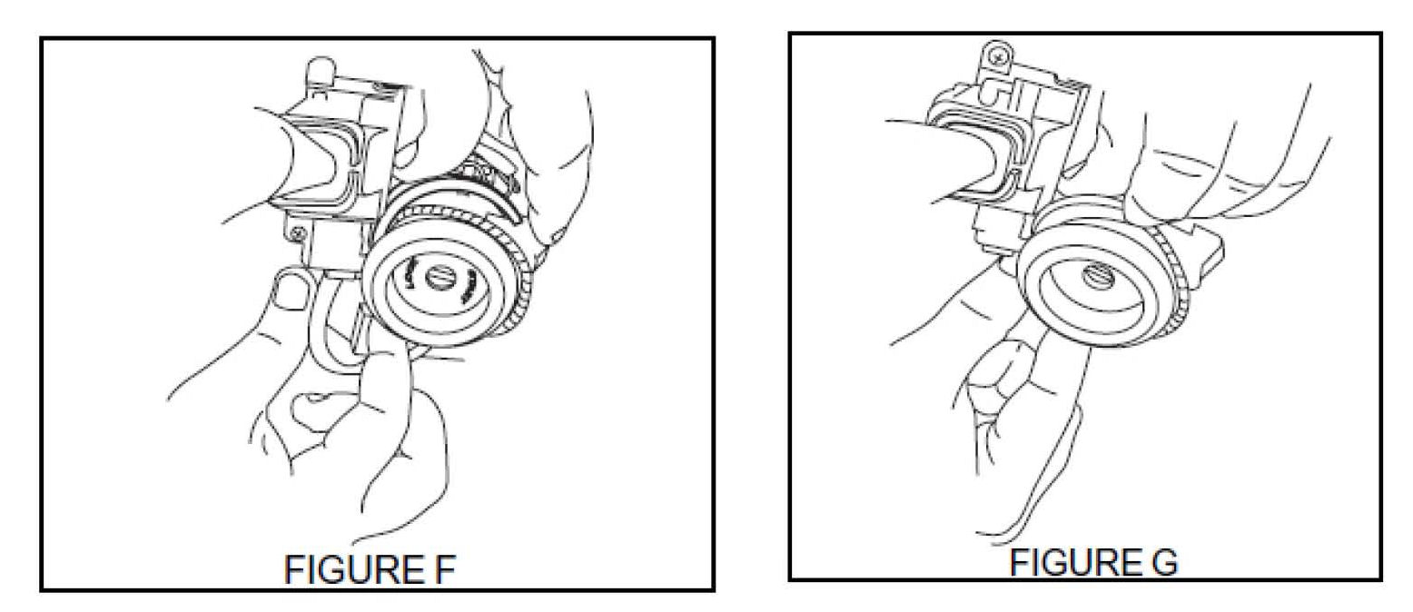 (4) Insert the immobilizer interface antenna ring placement clip back slightly towards the steering column (to limit interference with the multifunction switch assembly) and rotate downwards around the ignition cylinder. (FIGURES F & G, above)