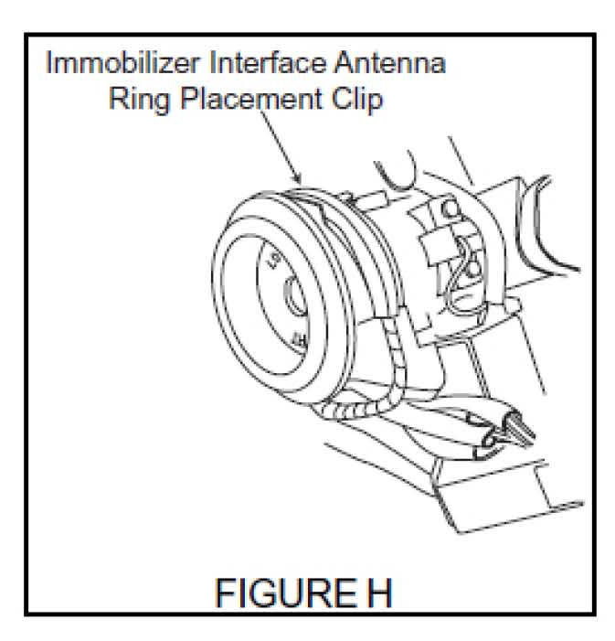 (5) Once the immobilizer interface antenna ring placement clip has been rotated into place around the left side of the ignition cylinder it can be pulled forward slightly to rest against the lip on the vehicle's ignition cylinder lens. (FIGURE H)