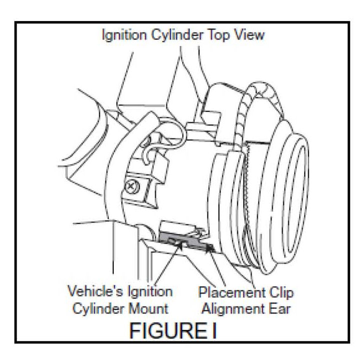 (6) After the immobilizer interface antenna ring placement clip is mounted in place, verify that the alignment ears are seated securely against the ignition cylinder mount and that the immobilizer interface antenna ring is tight and secure around the ignition cylinder. (FIGURE I)