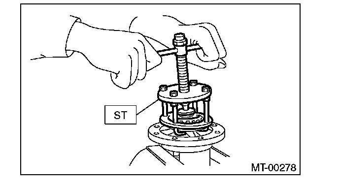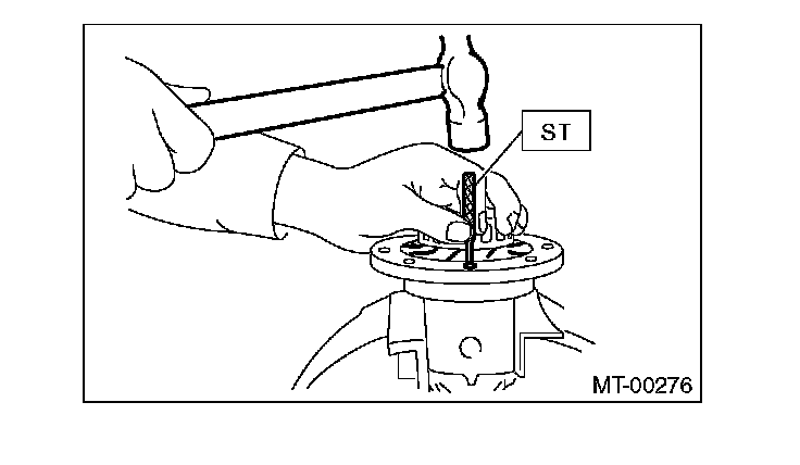 3. Align the pinion shaft and differential case with each hole, and drive the straight pin into the holes from the hypoid driven gear using ST.