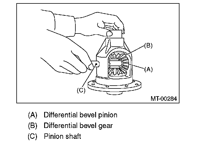 1. Install the differential bevel gear and differential bevel pinion together with washer, and insert the pinion shaft.