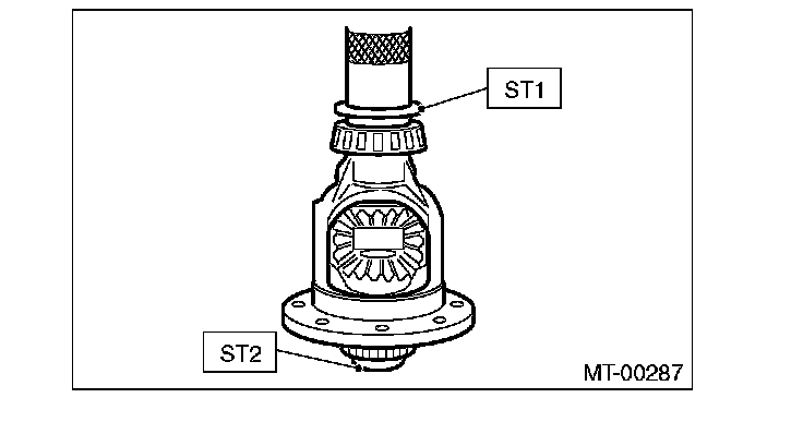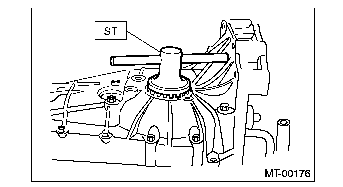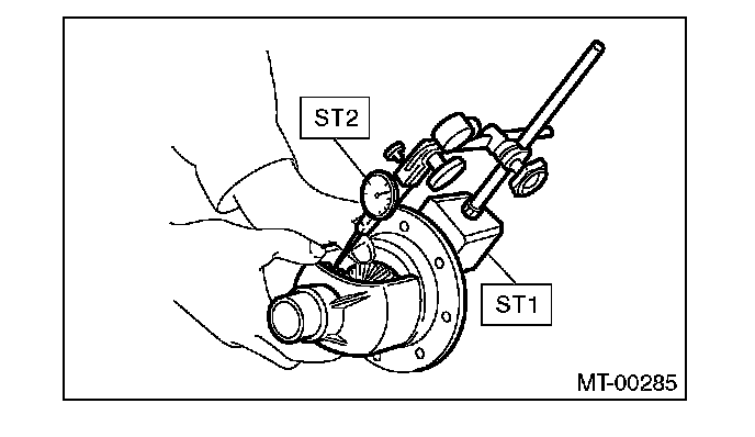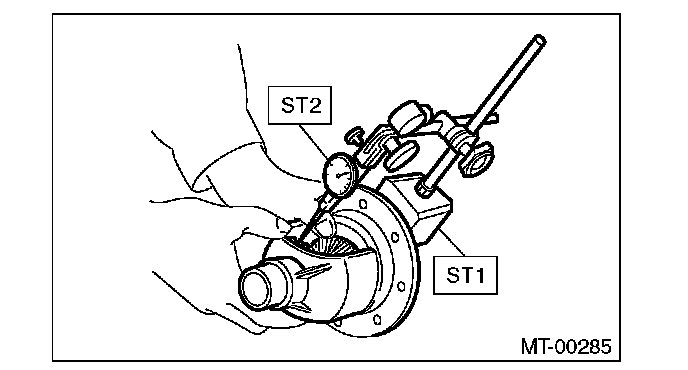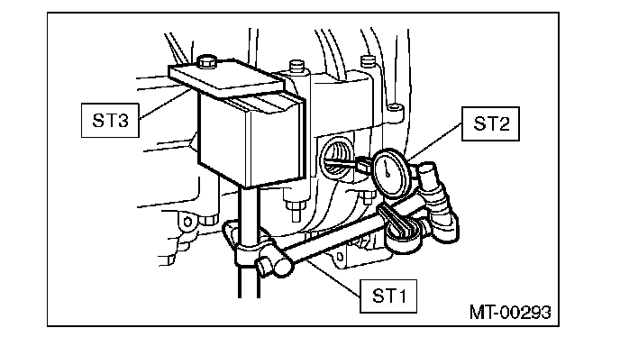 1. Set the ST1, ST2 and ST3. Insert the needle through transmission oil drain plug hole so that the needle comes in contact with the tooth surface on the right corner, and check the backlash.