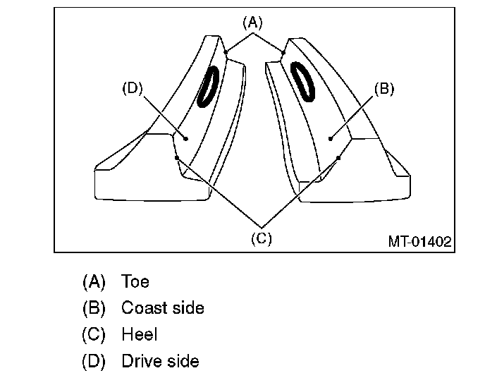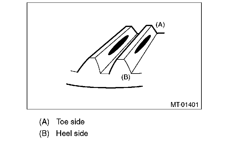 Check item: Tooth contact surface is slightly shifted toward the toe side under a no-load condition. (When driving, it moves towards the heel side.)