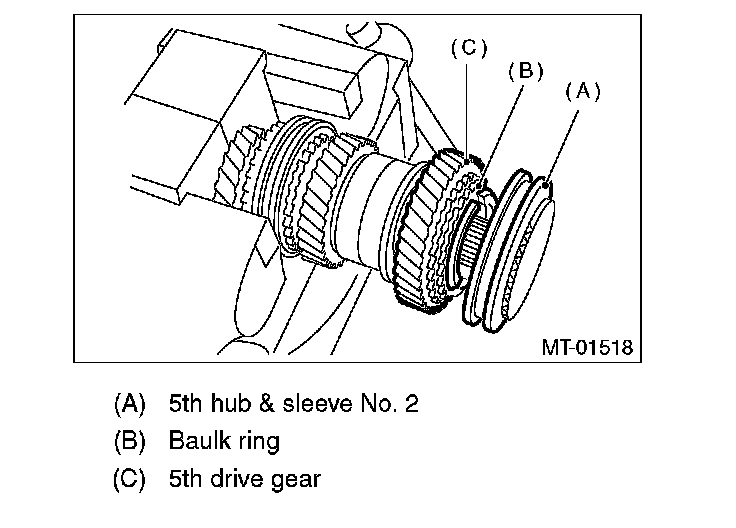 3. Remove the 5th hub & sleeve No. 2, baulk lever, baulk ring, and the 5th drive gear & needle bearing.