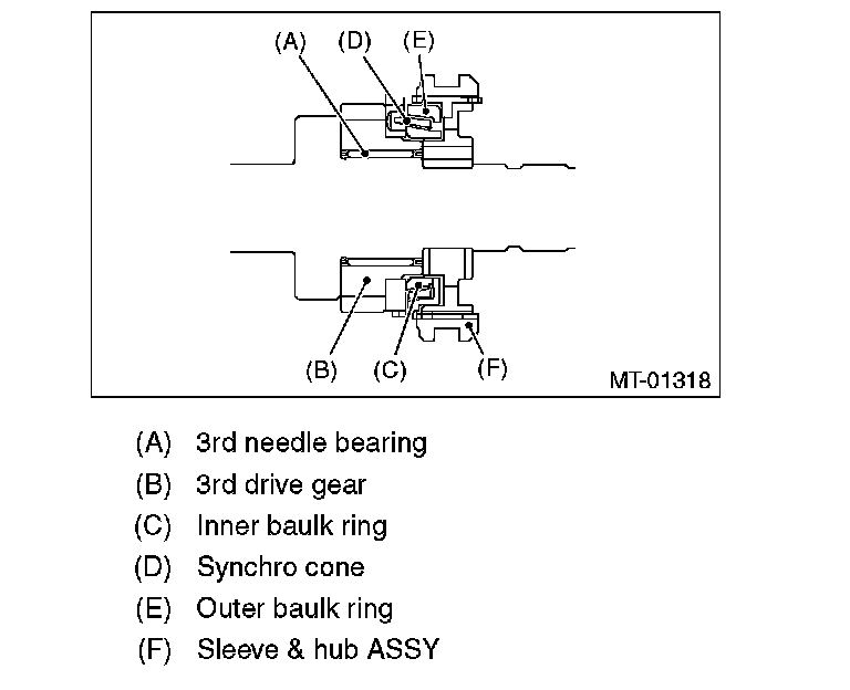 2. Install the 3rd drive gear, outer baulk ring, synchro cone, inner baulk ring, sleeve & hub assembly for the 3rd needle bearing, on the transmission main shaft.