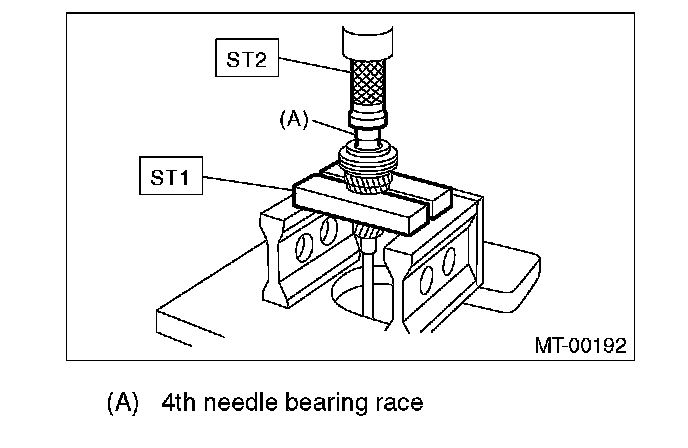 3. Install the 4th needle bearing race onto transmission main shaft using ST1, ST2 and press.