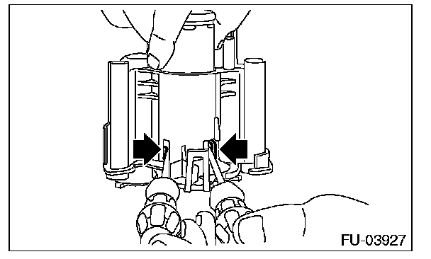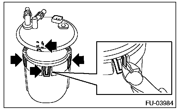 8. Lift the two tab holders connecting the pump assembly to the fuel filter using a flat tip screwdriver [with a shaft diameter of approx. 3 mm (0.12 in)], etc., and separate the fuel filter and pump assembly.