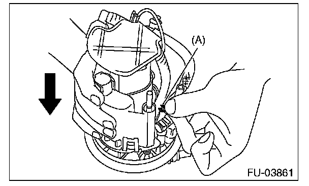 6. Push to compress the fuel filter assembly in the direction of the arrow, remove clip (A), and separate the sub tank bracket assembly and the fuel filter assembly.