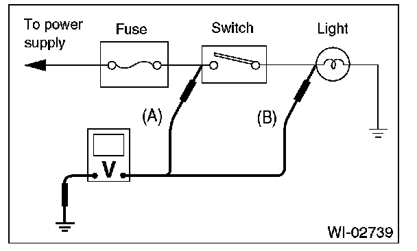 2. Contact the positive lead of the voltmeter on connector (A). The voltmeter will indicate a voltage.