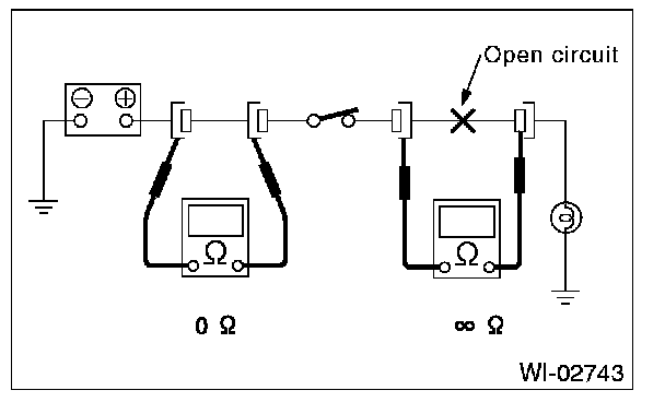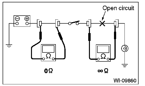 Disconnect all connectors affected, and check continuity in the wiring between adjacent connectors. When the ohmmeter indicates "infinite", the wiring is open.