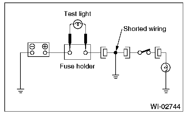 Connect a test light (rated at approx. 3 watts) in place of the blown fuse and allow current to flow through the circuit. Disconnect one connector at a time from the circuit. Starting with the one located farthest from the power supply. If the test light goes out when a connector is disconnected, the wiring between that connector and the next connector (farther from the power supply) is shorted.