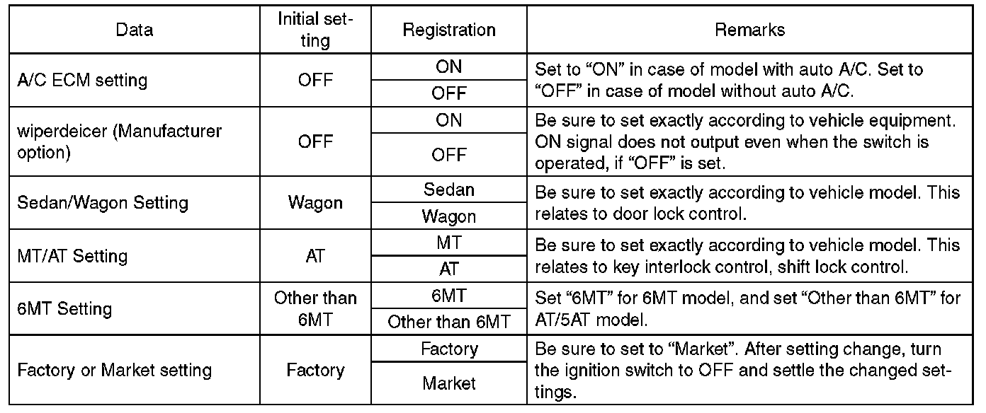 - If registrations and function setting are different from vehicle equipment, vehicle system does not operate normally and diagnosis cannot be performed correctly. Pay attention to following item.