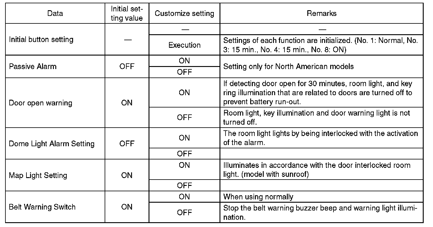 - Each settings have been set. It can be recognized by key ring illumination coming on in concocting with room light and going off with ignition switch turned to ON.