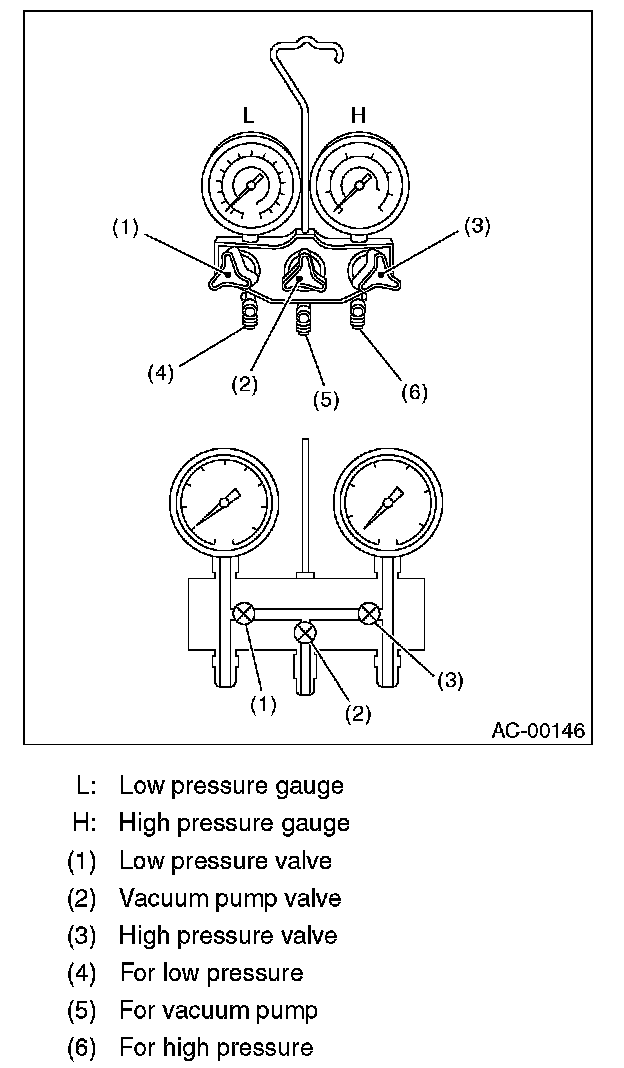 4. Operate the vacuum pump and open the low pressure and high pressure side valves. Next, open the center manifold hose valve, and begin evacuation.