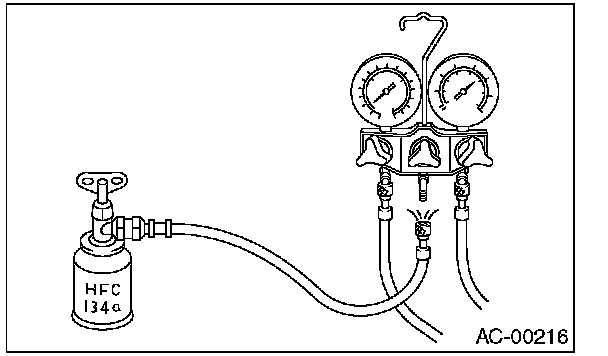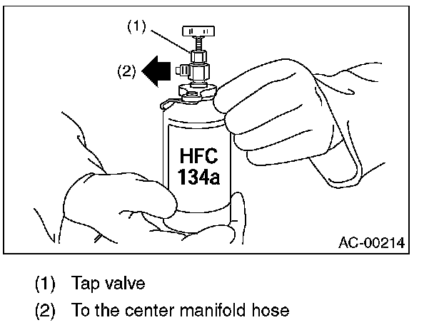 18. If the HFC-134a supply container becomes empty, close all valves, and close the can tap valve to replace the empty container. After replacing with a new HFC-134a supply container, perform air purge, and resume the filling operation.