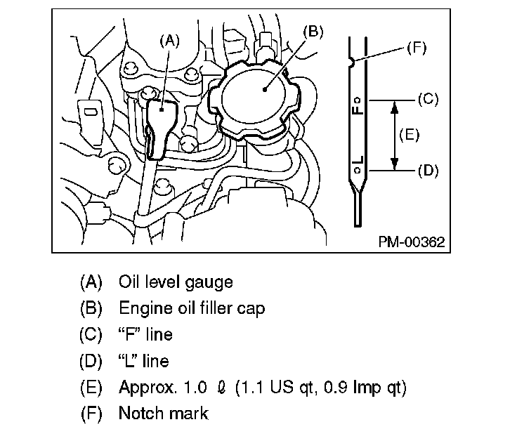 10) After stopping the engine, recheck the oil level. If necessary, add engine oil up to the "F" line on oil level gauge.