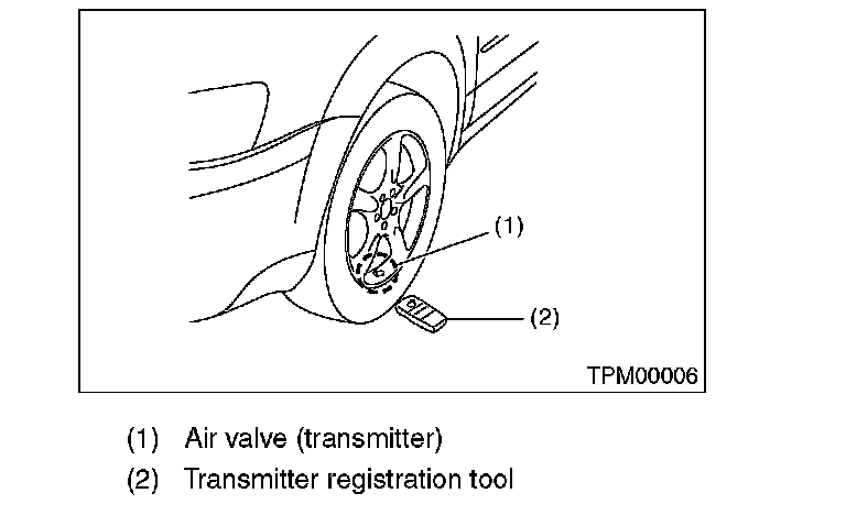 7) Touch the transmitter registration tool to the side wall area near the air valve on the front left tire, and press the switch. The transmitter ID is sent to the tire pressure monitoring control module. (At that time, the tire pressure warning light blinks to confirm that the registration has started.)