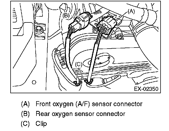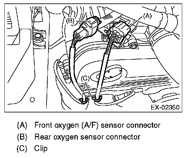 4. Remove the clip fastening the harness and disconnect the front oxygen (A/F) sensor connector.