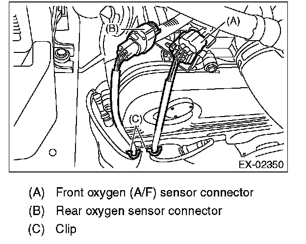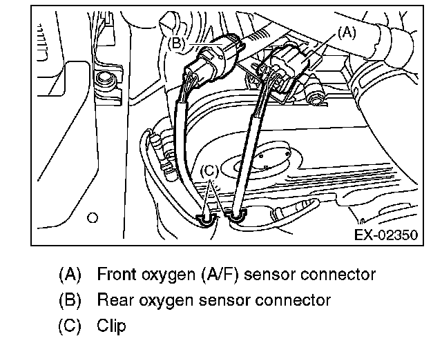 4. Remove the clip fastening the harness and disconnect the rear oxygen sensor connector.