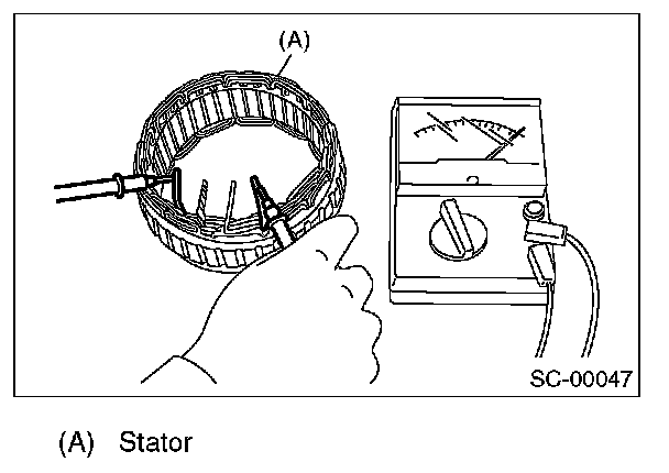 Inspect the continuity between the stator coil stator core and lead wire terminals. If the resistance is 1 ohm or less, the stator coil is grounded. Replace the stator assembly.