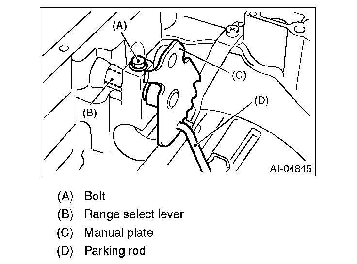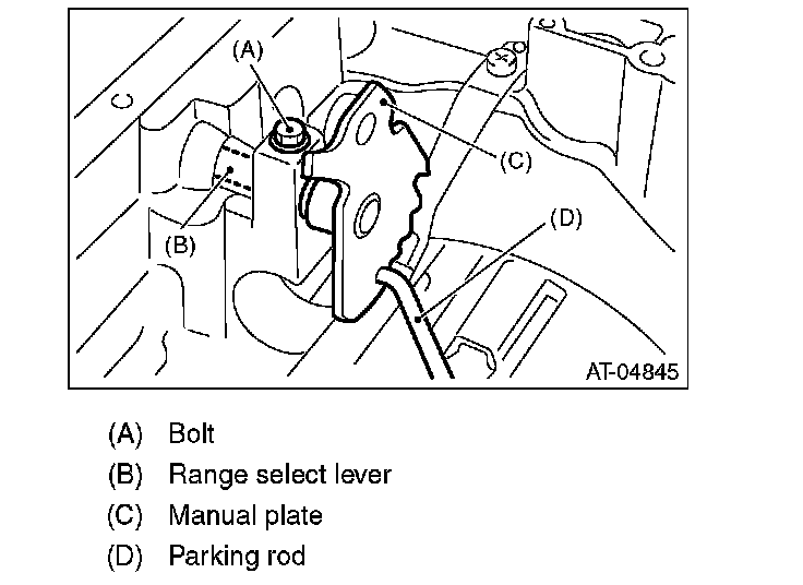 12) Remove the bolts securing select lever, and then remove the select lever, manual plate and parking rod.