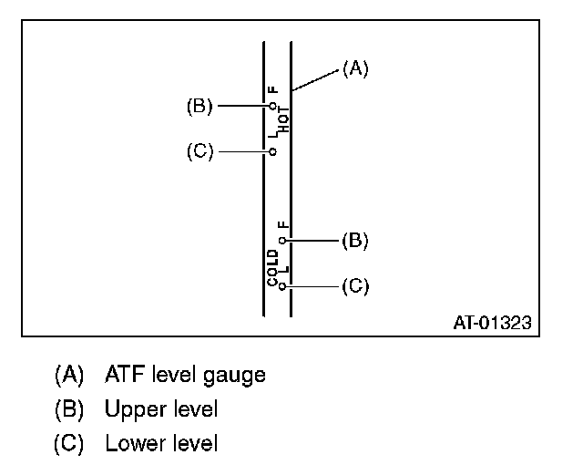 ^ When the transmission is cold, be careful not to add ATF to the upper level. Overfilling of ATF may cause oil splashing.