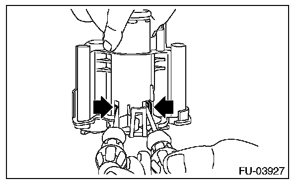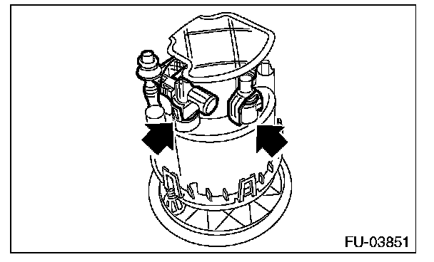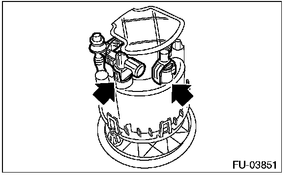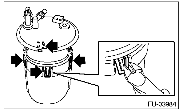8. Lift the two claw holding portions where the pump assembly is connected to the fuel filter using a flat tip screwdriver [dia. approx. 3 mm (0.12 in)] to disconnect the fuel filter and pump assembly.