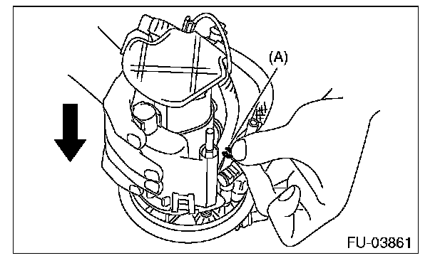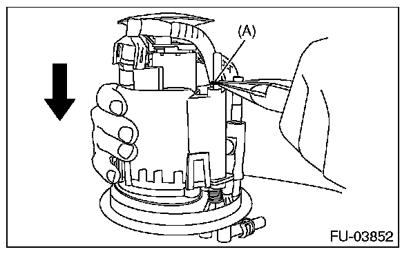 6. Push down the fuel filter assembly in the arrowed direction to remove clip (A), and then disconnect the sub tank bracket assembly and fuel filter assembly.