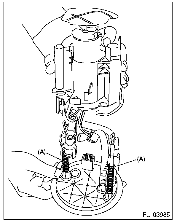 3. Attach springs (A) to the metal bars of the sub tank bracket assembly, and assemble the fuel filter assembly.