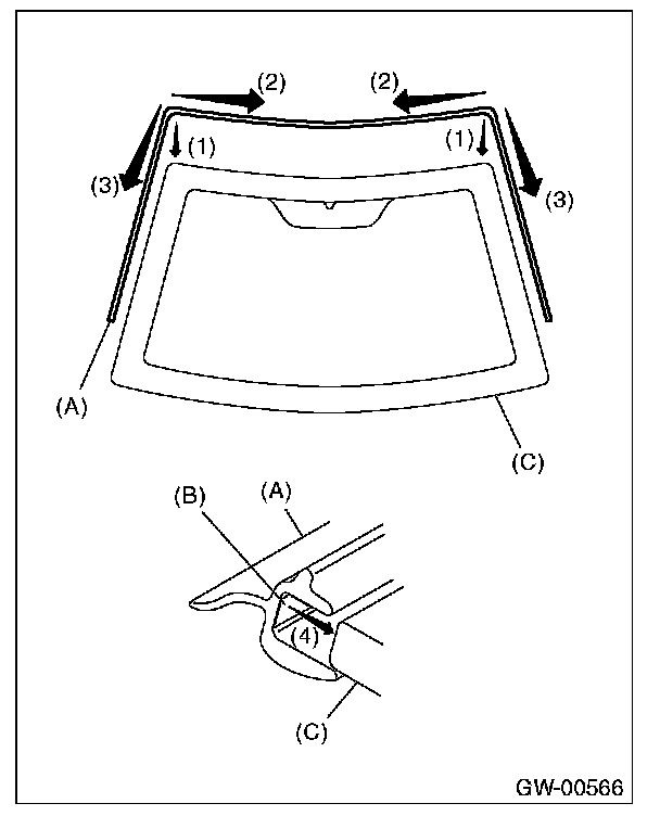 1. Align the molding (A) to both the upper edge ends of windshield glass (C).