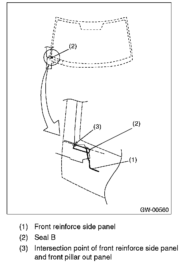 7. Apply the seal B (2) to terminal section of front reinforce side panel (1) and the intersection point (3) of front reinforce side panel and front pillar out panel.