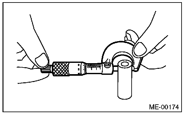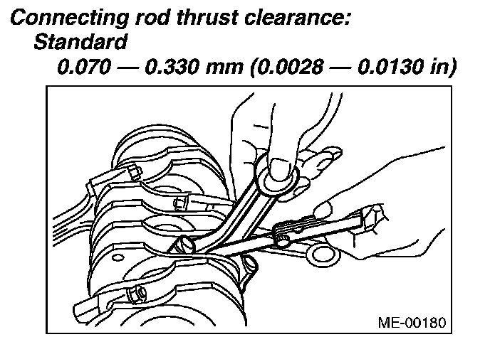 3) Install the connecting rod with bearings attached to the crankshaft, and using a thickness gauge, measure the thrust clearance. If the thrust clearance exceeds the standard or uneven wear is found, replace the connecting rod.