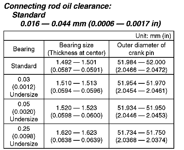 5) Measure the oil clearance on each connecting rod bearing using plastigauge. If any oil clearance is not within the standard, replace the defective bearing with a new part of standard size or undersize as necessary.
