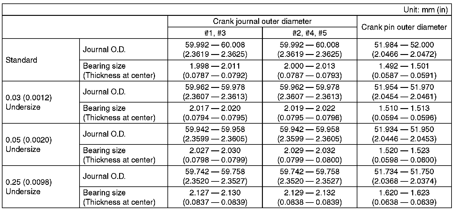 3) Inspect the crank journal and crank pin for wear. If they are not within the standard, replace the bearing with a suitable (undersize) one, and replace or grind to correct the crankshaft as necessary. When grinding the crank journal or crank pin, finish them to the specified dimensions according to the undersize bearing to be used.