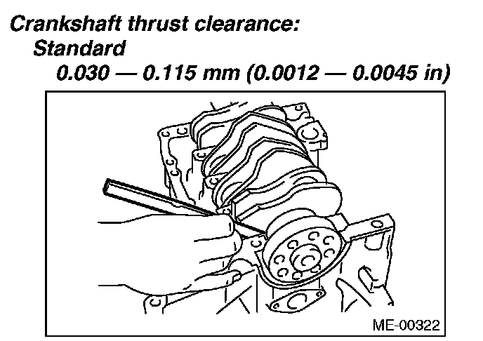 4) Use a thickness gauge to measure the thrust clearance of crankshaft at #5 crank journal bearing. If clearance exceeds the standard, replace the bearing.