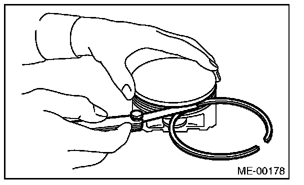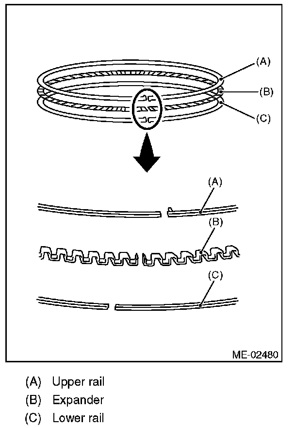 ^ Oil ring consists of the upper rail, expander and lower rail. When attaching the oil ring to the piston, pay attention to the direction of each rail.
