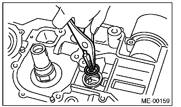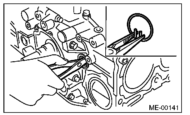 25) Rotate the crankshaft to bring #1 and #2 pistons to bottom dead center position, then remove the piston snap ring through service hole of #1 and #2 cylinders.