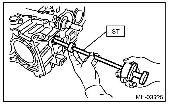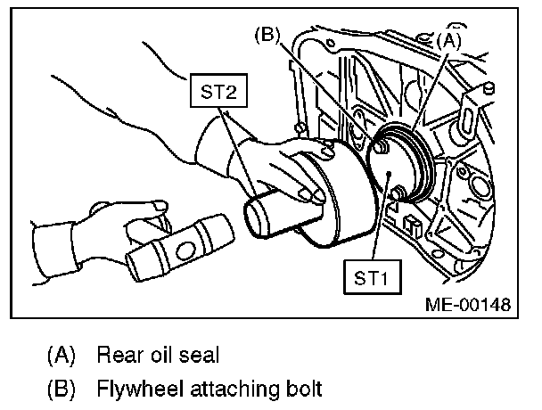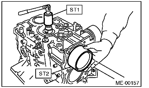 12) Apply a coat of engine oil to the oil seal periphery, then install the rear oil seal using ST1 and ST2.