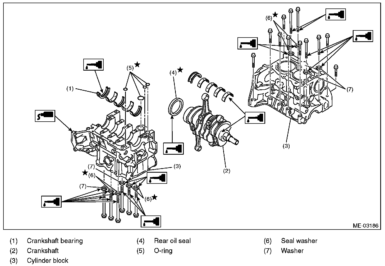 1) Remove oil on the mating surface of cylinder block before installation. Apply a coat of engine oil to the bearing and crankshaft journal.