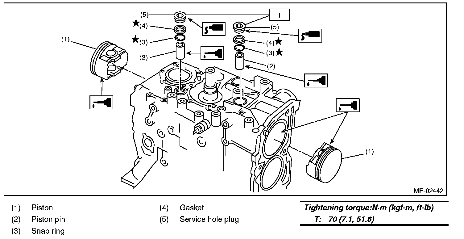 3) Apply a coat of engine oil to piston pin, and insert the piston pin into piston and connecting rod through service hole.