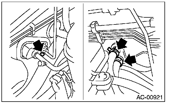 4. Remove the bolts securing expansion valve and pipe in engine compartment. Release the heater hose clamps in engine compartment to remove the hoses.